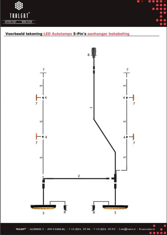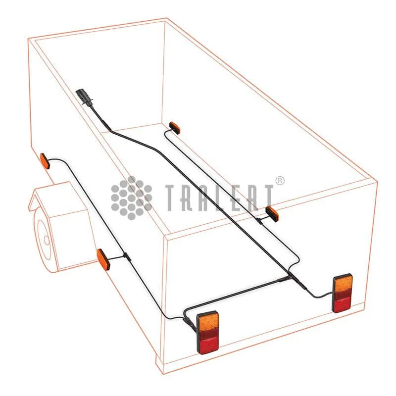2,1m. verbindingskabel tussen de linker en de rechter lamp van het 5 pins LED Autolamps bekabelingsysteem. Enerzijds wordt de kabel aangesloten met een waterdichte verbinding op het T-stuk van de hoofdkabel en anderzijds wordt de kabel aangesloten op het linker achterlicht. Bij de connector voor het linker achterlicht vindt u vervolgens weer een 2 aderige aftakking voor het aansluiten van de markeringverlichting, kentekenverlichting en breedtelampen.