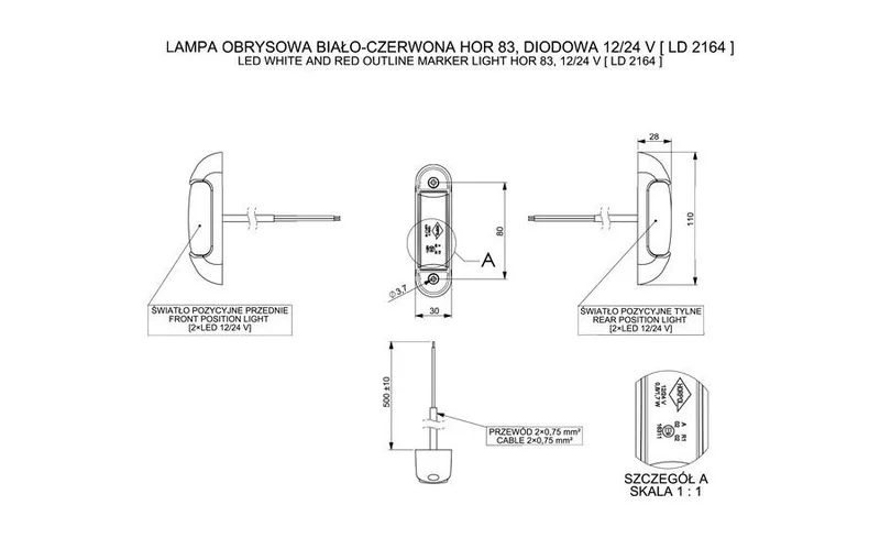 LED Breedtelamp compact rood/wit/amber 12/24v 50cm kabel