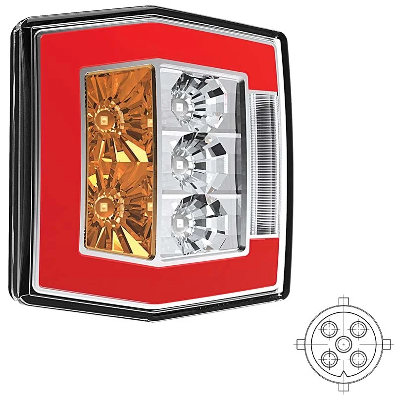 Dit LED achterlicht met Lavaflowlook is uitgevoerd met kentekenverlichting. Dit achterlicht is zeer geschikt voor gebruik op uw vrachtwagen, aanhanger, oplegger en trailer. Deze lamp is uitgevoerd met een 5-PIN’s bajonet aansluiting.
